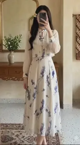 CHICMORE Gaun lengan panjang rok panjang modis bermotif cantik elegan