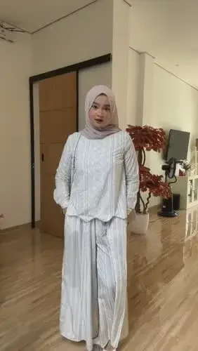ASAYA Kemeja lengan panjang dengan kerah bulat dan celana panjang lebar bermotif garis polos set dua potong