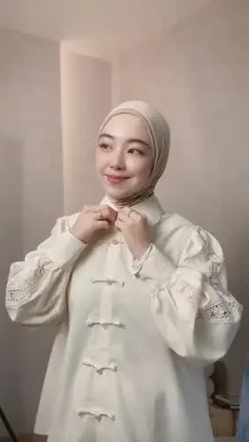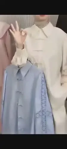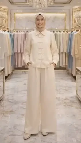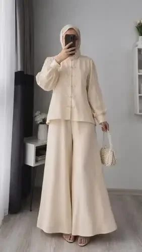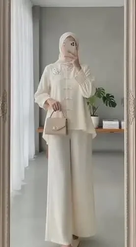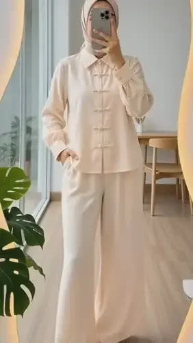 CHICMORE Kemeja lengan panjang dengan aksen bordir, kancing tangan, dipadukan dengan celana lebar polos