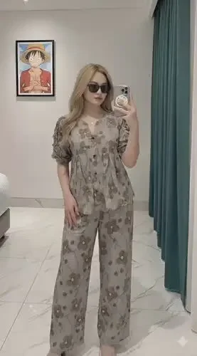 FADFAD Setelan wanita desain ceruk atasan bermotif dan celana panjang lebar dua potong bergaya dan elegan