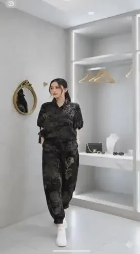 FADFAD Setelan dua potong motif cetak unik ritsleting dan lengan pendek + celana panjang kaki lebar