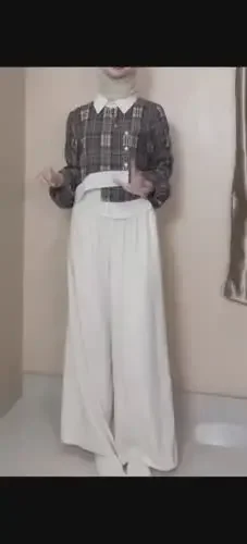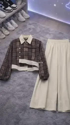 ASAYA Setelan dua potong: kemeja lengan panjang dengan desain kancing unik di bagian bawah dan kerah, dipadukan dengan celana panjang lebar polos