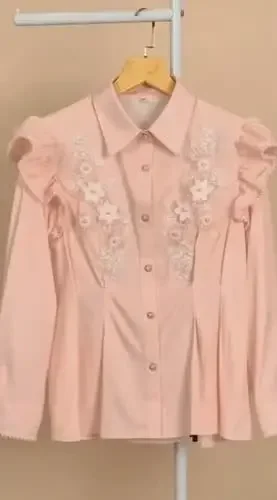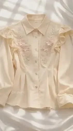 [READY STOCK]FADFAD Atasan kemeja putih lengan panjang dengan variasi bunga dibagian depan gaya kasual untuk wanita