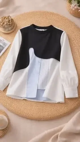 [NEW]FADFAD Atasan kemeja lengan panjang patchwork dua potong palsu gaya retro untuk wanita