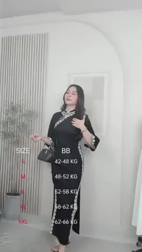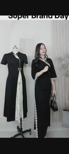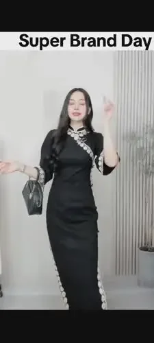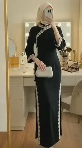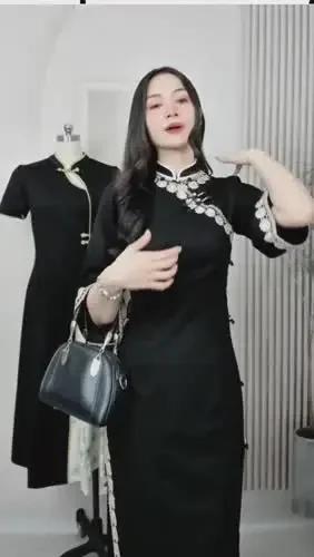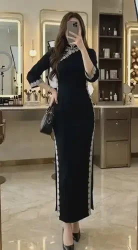CHICMORE Gaun gaya cheongsam wanita feminime dengan lengan tiga perempat warna hitam
