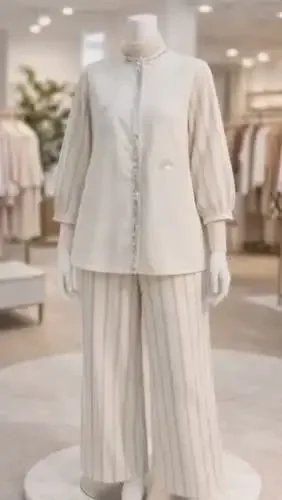 [NEW]CHICMORE Setelan kemeja wanita kasual dengan motif garis-garis bordir tidak beraturan dan patchwork, dipadukan dengan celana panjang lebar.