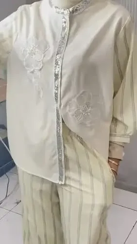 [NEW]CHICMORE Atasan wanita sederhana dengan desain pita berkilau ditambah aksesori bordir bunga, dipadukan dengan celana lebar motif garis bermotif cetak warna polos