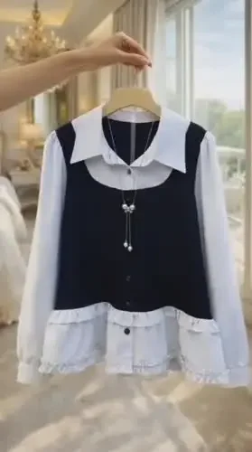 FADFAD Atasan kemeja dua potong palsu lengan panjang dan kerah polo